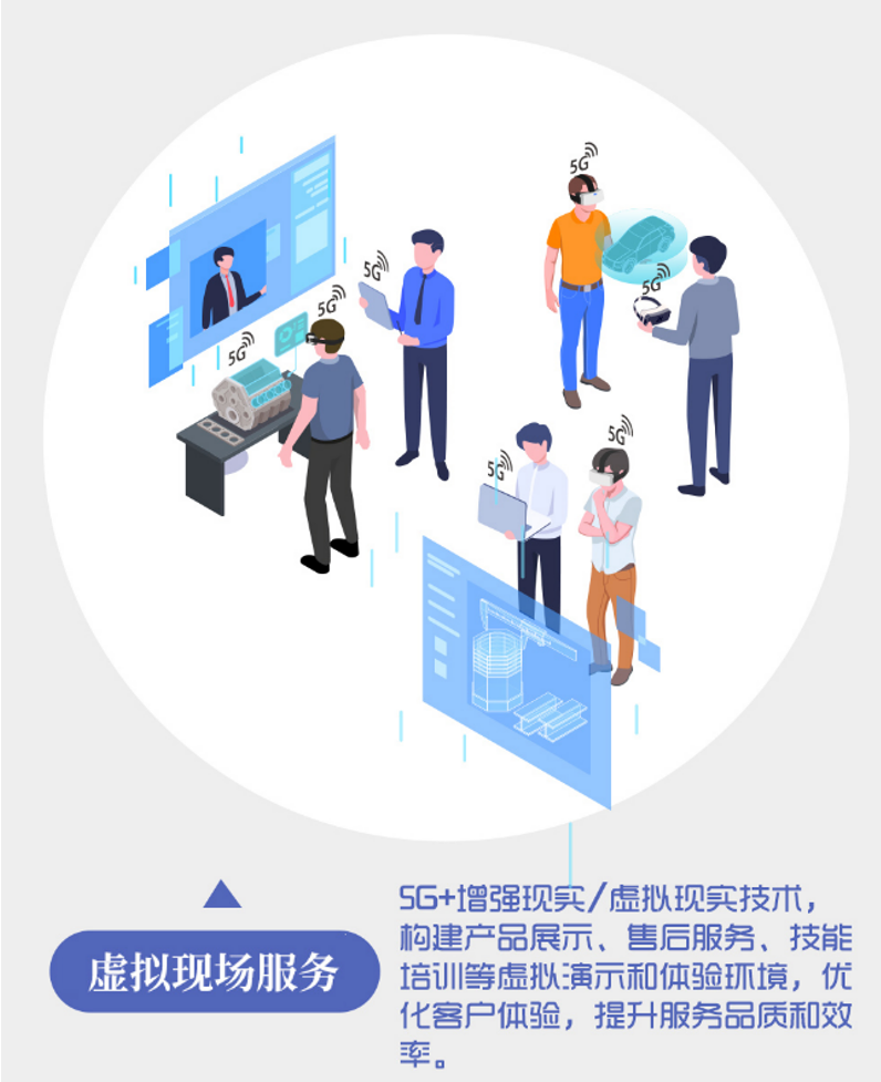 虛擬現(xiàn)場服務(wù)主要包括產(chǎn)品展示體驗(yàn)、輔助技能學(xué)習(xí)、遠(yuǎn)程運(yùn)維指導(dǎo)等三類服務(wù)。產(chǎn)品展示體驗(yàn)服務(wù)通過對工業(yè)產(chǎn)品的外型數(shù)據(jù)及內(nèi)部結(jié)構(gòu)進(jìn)行立體化建模,構(gòu)建虛擬數(shù)字展廳,通過5G網(wǎng)絡(luò)傳輸至平板電腦、增強(qiáng)現(xiàn)實(shí)/虛擬現(xiàn)實(shí)(AR/VR)眼鏡等智能終端,與數(shù)字模型實(shí)時(shí)互動(dòng),實(shí)現(xiàn)產(chǎn)品細(xì)節(jié)的沉浸式體驗(yàn)和感受。輔助技能學(xué)習(xí)服務(wù)基于5G和AR/VR融合構(gòu)建貼近真實(shí)場景的全虛擬場景,進(jìn)行操作技能培訓(xùn)和自由操作練習(xí),提高技能學(xué)習(xí)效率。遠(yuǎn)程運(yùn)維指導(dǎo)服務(wù)通過在全虛擬場景中,疊加遠(yuǎn)端專家指導(dǎo)數(shù)據(jù)形成端云協(xié)同,使端側(cè)獲得實(shí)時(shí)操作指導(dǎo),提升運(yùn)維服務(wù)的效率和質(zhì)量。
