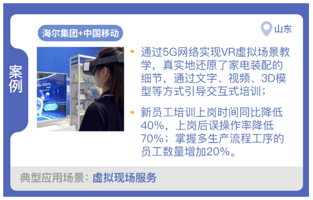 海爾集團(tuán)與中國移動(dòng)合作,開展了“5G全連接園區(qū)”項(xiàng)目建設(shè),實(shí)現(xiàn)了虛擬現(xiàn)場服務(wù)場景的應(yīng)用。基于算法上云架構(gòu),通過5G網(wǎng)絡(luò)實(shí)現(xiàn)VR內(nèi)容的云端存儲(chǔ)。根據(jù)使用需求下載對應(yīng)的VR內(nèi)容用于現(xiàn)場教學(xué),真實(shí)地還原了家電裝配的細(xì)節(jié),通過文字、圖片、聲音、視頻、3D模型等方式引導(dǎo)交互式培訓(xùn),幫助培訓(xùn)人員迅速掌握技術(shù)要領(lǐng),降低了部署成本,解決了新員工培訓(xùn)上崗時(shí)間周期長的問題。自海爾工廠VR員工培訓(xùn)平臺(tái)投入使用以來,新員工培訓(xùn)上崗時(shí)間同比降低40%,上崗后誤操作率降低70%;老員工自主學(xué)習(xí)時(shí)長增加35%,掌握多生產(chǎn)流程工序的產(chǎn)線員工數(shù)量增加20%。