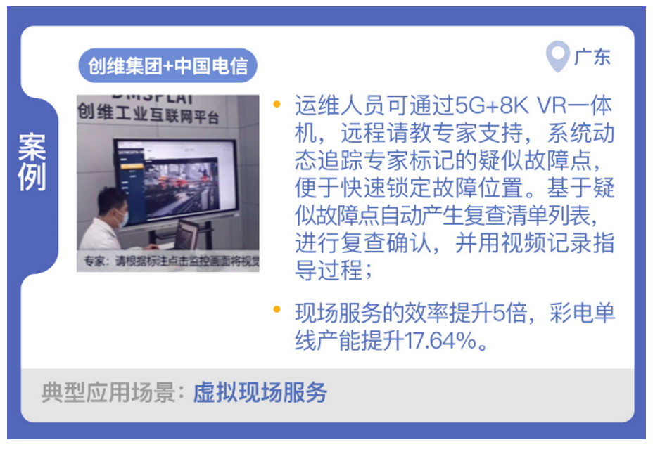 深圳創(chuàng)維-RGB電子集團(tuán)有限公司與中國電信合作,開展了“5G+8K柔性智能工廠”項(xiàng)目建設(shè),實(shí)現(xiàn)了虛擬現(xiàn)場服務(wù)場景的應(yīng)用。利用自主研發(fā)的創(chuàng)維8K VR一體機(jī)設(shè)備和5G完美融合,形成“云管端”的整體解決方案。遇到問題時(shí),現(xiàn)場運(yùn)維人員佩戴創(chuàng)維8K VR一體機(jī),根據(jù)系統(tǒng)投射到視野前方的信息獲得可視化指導(dǎo)幫助。信息輔助無法解決問題時(shí),打開遠(yuǎn)程專家支持,專家以第一視角畫面清晰獲知現(xiàn)場情況,用紅框標(biāo)記疑似故障點(diǎn),實(shí)時(shí)反饋至VR眼鏡。系統(tǒng)能夠?qū)σ伤乒收宵c(diǎn)進(jìn)行動(dòng)態(tài)跟蹤,方便運(yùn)維人員快速鎖定故障位置。通過記錄疑似故障點(diǎn),自動(dòng)產(chǎn)生復(fù)查清單列表,實(shí)現(xiàn)對維修過程關(guān)鍵點(diǎn)復(fù)查確認(rèn)。同時(shí),每次遠(yuǎn)程指導(dǎo)都以視頻形式進(jìn)行記錄,用于案例分析或教學(xué)使用。通過應(yīng)用該技術(shù),創(chuàng)維現(xiàn)場服務(wù)的效率提升了5倍,彩電單線產(chǎn)能提升17.64%,一線質(zhì)檢員工減少40%,出口提升71.25%。