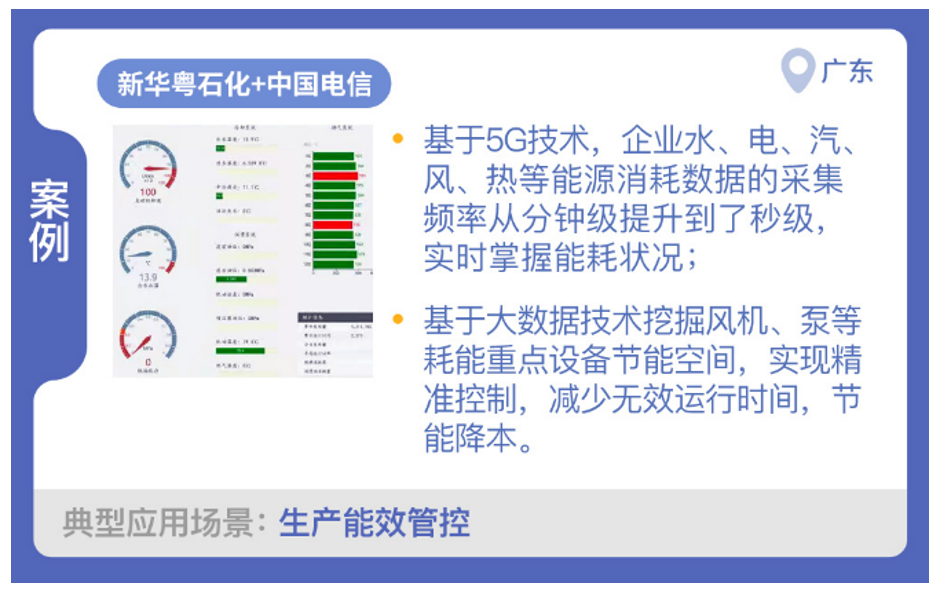 廣東新華粵石化股份有限公司與中國電信合作,開展了“能耗在線監(jiān)測”項(xiàng)目建設(shè),實(shí)現(xiàn)了生產(chǎn)能效管控場景的應(yīng)用。利用水表、電表、蒸汽測量儀、風(fēng)速表、冷熱計量表等計量設(shè)備采集企業(yè)水、電、汽、風(fēng)、熱等能源消耗數(shù)據(jù),通過5G網(wǎng)絡(luò)傳輸至企業(yè)綜合能源管理平臺,并按時按需上傳到廣東省能耗在線監(jiān)管平臺,采集頻率從分鐘級提升到了秒級,顯著提升了數(shù)據(jù)采集的效率。綜合能源管理平臺可實(shí)時監(jiān)測電流、電壓、冷熱量計量等運(yùn)行參數(shù),通過用電趨勢分析、用電異常監(jiān)測、用熱對比分析等方法,實(shí)時掌握能耗狀況。基于大數(shù)據(jù)分析技術(shù)挖掘風(fēng)機(jī)、泵等耗能重點(diǎn)設(shè)備節(jié)能空間,進(jìn)行節(jié)能改造,實(shí)現(xiàn)精準(zhǔn)控制,減少無效運(yùn)行時間,提高了生產(chǎn)能耗信息化管理水平,降低了生產(chǎn)成本。