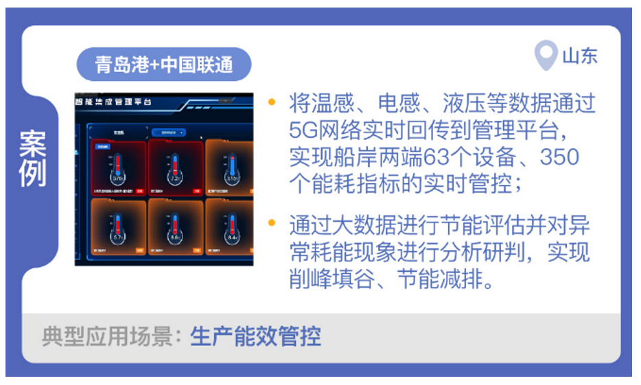 山東港口青島港集團(tuán)有限公司與中國聯(lián)通合作,開展了“青島港5G智慧港口”項(xiàng)目建設(shè),實(shí)現(xiàn)了生產(chǎn)能效管控場景的應(yīng)用。通過5G網(wǎng)絡(luò),將溫感、電感、液壓、煙感等傳感器采集的數(shù)據(jù)實(shí)時回傳到智能集成管理平臺,實(shí)現(xiàn)船岸兩端63個設(shè)備、350個能耗指標(biāo)的實(shí)時管控。通過大數(shù)據(jù)分析對船舶動力系統(tǒng)進(jìn)行節(jié)能評估,動態(tài)調(diào)整船舶的經(jīng)濟(jì)航速,實(shí)現(xiàn)削峰填谷、節(jié)能減排。通過自動化采集設(shè)備運(yùn)行數(shù)據(jù),提升了危險環(huán)境下的安全生產(chǎn)管理能力,提高安全生產(chǎn)預(yù)測效率和管理水平。針對異常耗能現(xiàn)象進(jìn)行分析研判,為設(shè)備的檢修維護(hù)提供決策支持。每年節(jié)省拖輪運(yùn)維費(fèi)用100萬元,節(jié)省人工檢測成本40萬元,檢測效率提升30%。