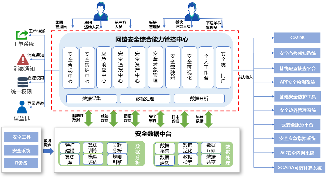 安全綜合能力管控平臺采用集團集中部署,用戶分權分域模式建設,支持微服務架構,通過集團側安全工具的集中納管、安全能力的分類調用,以IPDRR模型為指引構建安全能力中心,為浙能集團及下屬單位安全運營人員提供安全服務。建設安全合規中心、安全監測中心、安全防護中心、應急響應中心,依托浙能集團數據中臺安全數據實現安全駕駛艙,在滿足安全監管要求的同時,具備網絡安全中臺演進能力,為浙能集團安全建設降本增效,解決浙能集團安全設備管理建設,安全運營缺乏協同等問題。