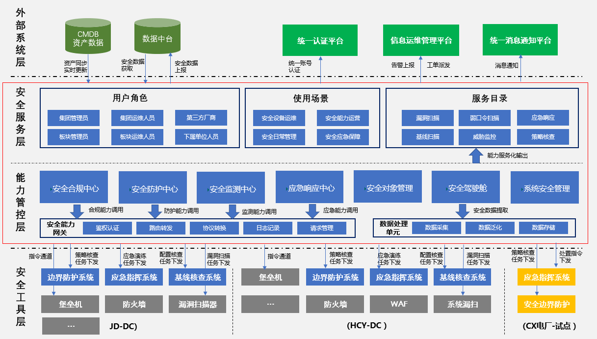 本期方案總體架構分為四層,自下而上分別為安全工具層、能力管控層、安全服務層、外部系統層