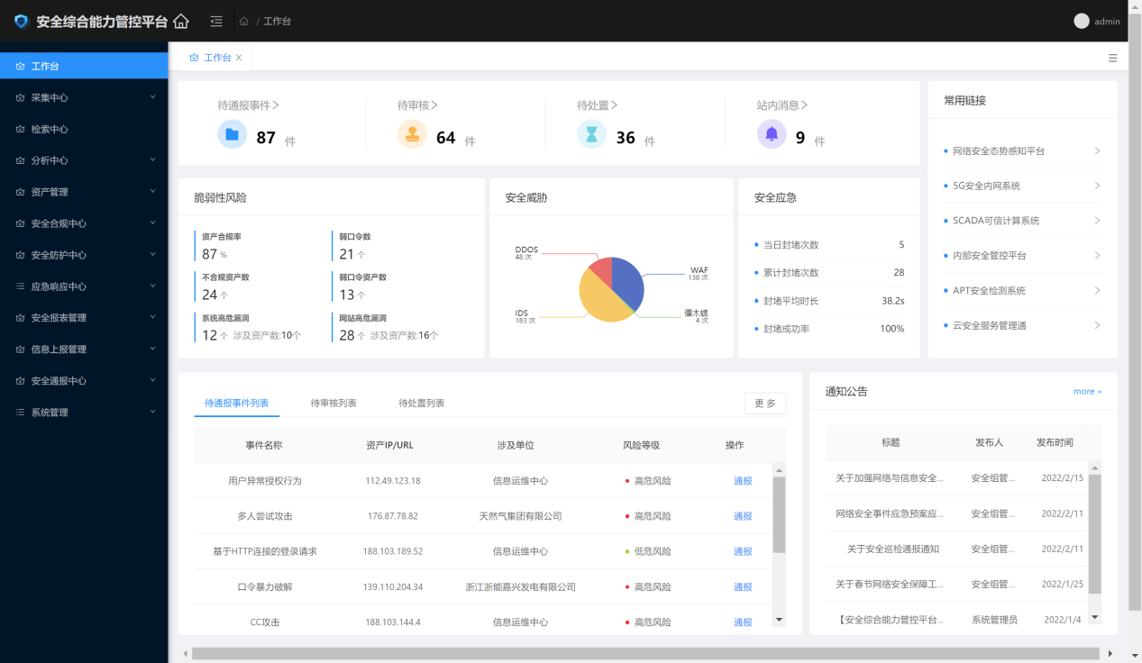 日常運營:在日常安全運營期間,系統可提供安全設備合規掃描、弱口令掃描,支持對新入網設備進行合規基準檢查,針對不符合要求的策略項進行整改篩查;提供系統漏洞掃描、網站漏洞掃描等服務,針對集團內部資產進行定期漏洞掃描,并對中高危漏洞進行整改核查;提供防火墻策略審計服務,針對防火墻設備的策略進行在線/離線采集,通過多維分析算法進行策略解析,輸出審計報表,針對不合規策略問題項進行處理;提供安全事件通報預警服務,可對安全事件的上報、審核、通報、處置流程進行管理記錄,及時對安全事件進行響應處置;提供安全應急處置入口,針對日常發現的需要進行封堵操作IP地址進行一鍵封堵。