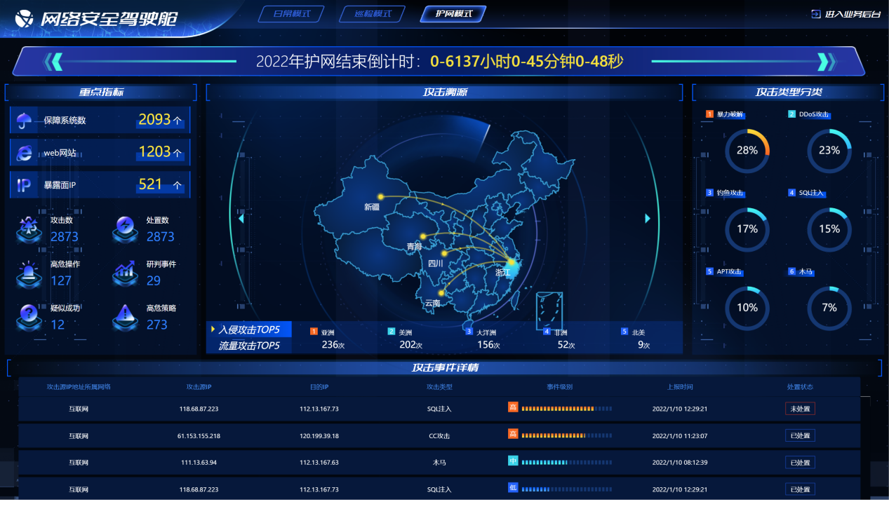 將獲取到的威脅數據、脆弱性數據與資產數據進行關聯,形成網絡安全決策依據,構建安全駕駛艙,從日常模式、巡檢模式、護網模式多維度展現安全工作的重點關注指標,反映網絡運行及安全狀態,將安全風險形象、直觀地呈現給安全決策者和管理人員,方便安全運營管理者全局掌握浙能集團網絡安全風險及運行情況,為安全工作提供決策支撐。