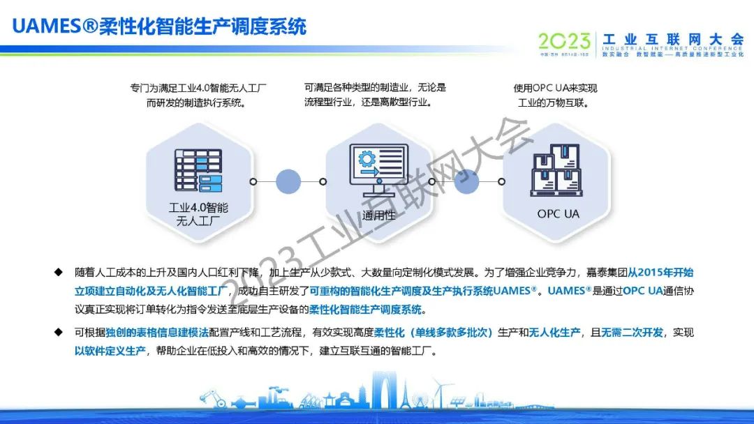 張譽表示隨著人工成本的上升及國內人口紅利的下降,加上工業(yè)正在從大批量、單一化的傳統(tǒng)生產(chǎn)模式,轉變?yōu)樾∨?、多樣性的柔性化生產(chǎn),中國工業(yè)從自動化向智能化的轉變已經(jīng)是大勢所趨。為了增強企業(yè)競爭力,嘉泰建立自動化及無人化智能工廠,自主研發(fā)了可重構的智能化生產(chǎn)調度及生產(chǎn)執(zhí)行系統(tǒng)UAMES??筛鶕?jù)獨創(chuàng)的表格建模法配置產(chǎn)線和工藝流程,有效實現(xiàn)高度柔性化(單線多款多批次)生產(chǎn)和無人化生產(chǎn),且無需二次開發(fā),實現(xiàn)以軟件定義生產(chǎn)。幫助企業(yè)在低投入和高效的情況下,建立互聯(lián)互通的智能工廠。同時,同樣基于信息模型的UAMES與RPAS的協(xié)作,也為企業(yè)未來大規(guī)模數(shù)字化打下了堅實的基礎。
