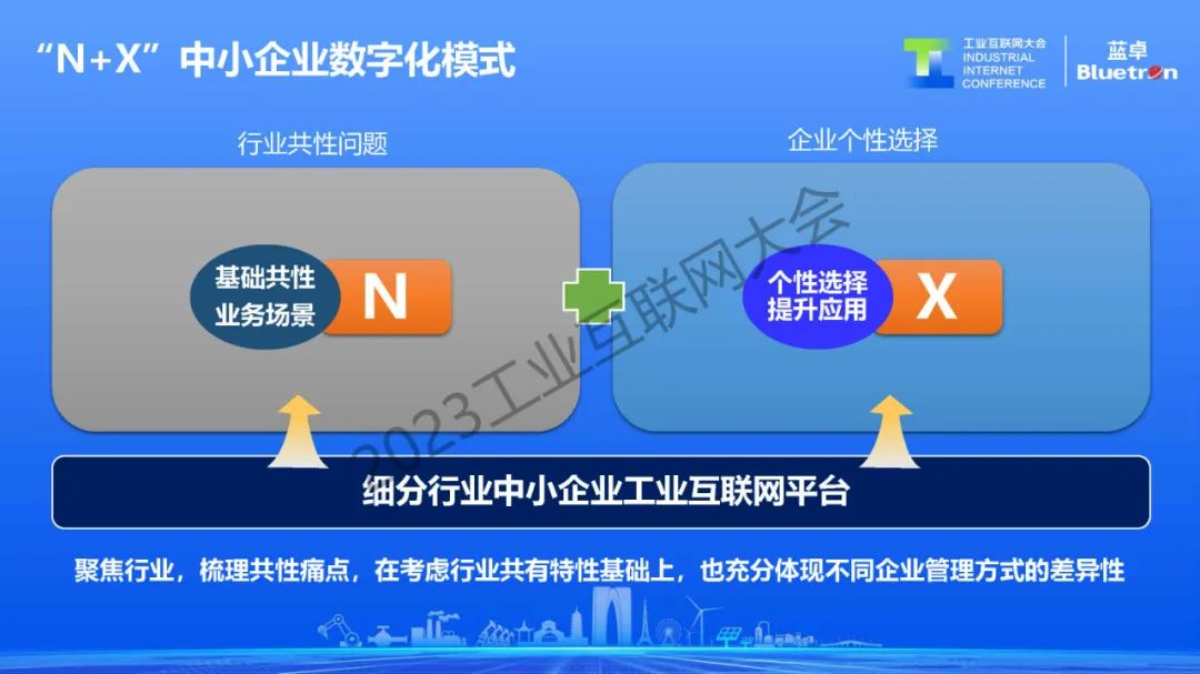 而中小企業(yè)用工業(yè)互聯(lián)網(wǎng)實(shí)現(xiàn)數(shù)字化轉(zhuǎn)型是完全另外一個邏輯。因?yàn)橹行∑髽I(yè)通常是缺資金、缺人員、缺技術(shù),處于一種不敢轉(zhuǎn)、不愿轉(zhuǎn)、不會轉(zhuǎn)和轉(zhuǎn)不起的狀態(tài)。而藍(lán)卓在過去幾年用工業(yè)操作系統(tǒng)賦能中小企業(yè)數(shù)字化進(jìn)行實(shí)踐,逐漸形成了1+1+N+X模式。