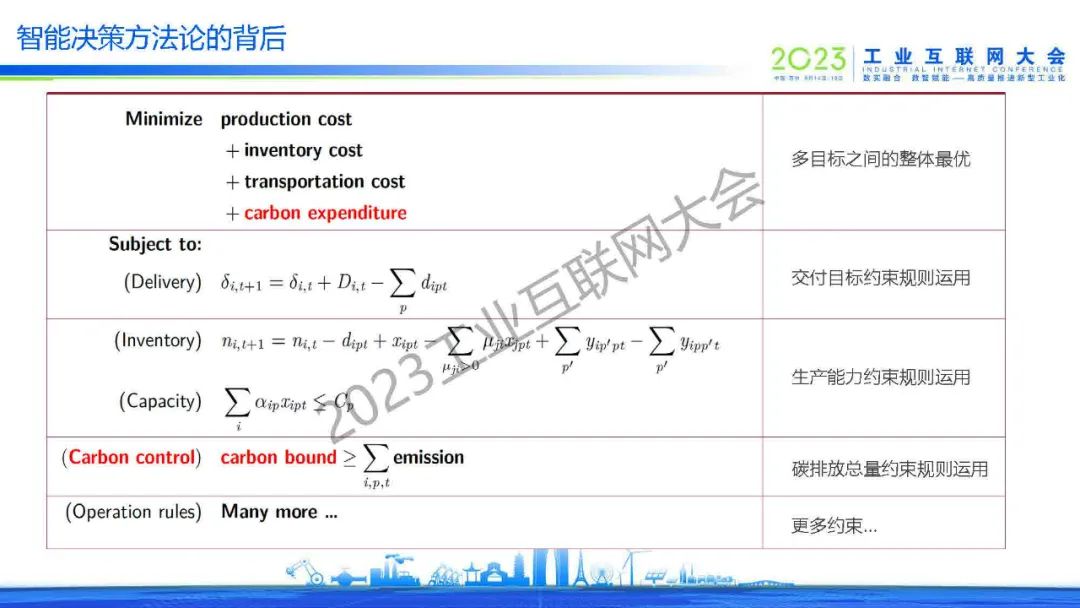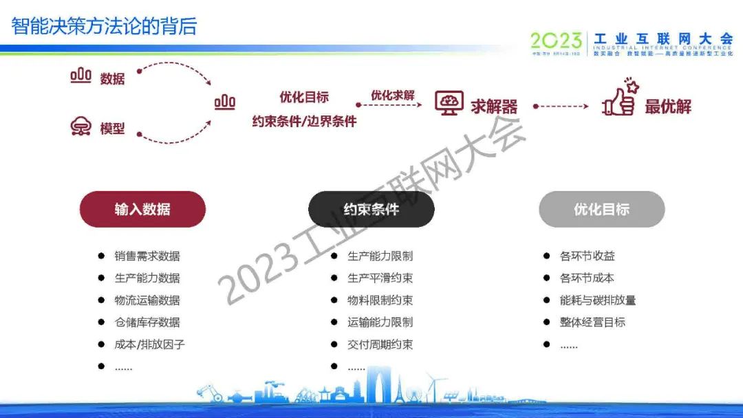 王曦分享了裝備、化工和耐用消費(fèi)品的三個需求樣例,提出了在服務(wù)工業(yè)數(shù)字化轉(zhuǎn)型升級中觀察到的四大需求:數(shù)據(jù)驅(qū)動、決策導(dǎo)向、尋找最優(yōu)和快速前瞻。智能決策方法論是通過輸入數(shù)據(jù)和模型,在優(yōu)化目標(biāo)和約束條件(邊界條件)下優(yōu)化求解出最優(yōu)解。