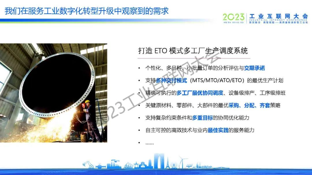 “裝備制造企業(yè)的數(shù)字化轉(zhuǎn)型就是打造 ETO 模式多工廠生產(chǎn)調(diào)度系統(tǒng)。它涵蓋了很多信息的抽象性需求描述,可能包括多品種,小批量訂單的交期承諾,可能包括個性化、多品種、小批量訂單的分析評估與交期承諾、支持多種交付模式(MTS/MTO/ATO/ETO)的最優(yōu)生產(chǎn)計劃、精確可執(zhí)行的多工廠最優(yōu)協(xié)同調(diào)度、設(shè)備級排產(chǎn)、工序級排班等。“