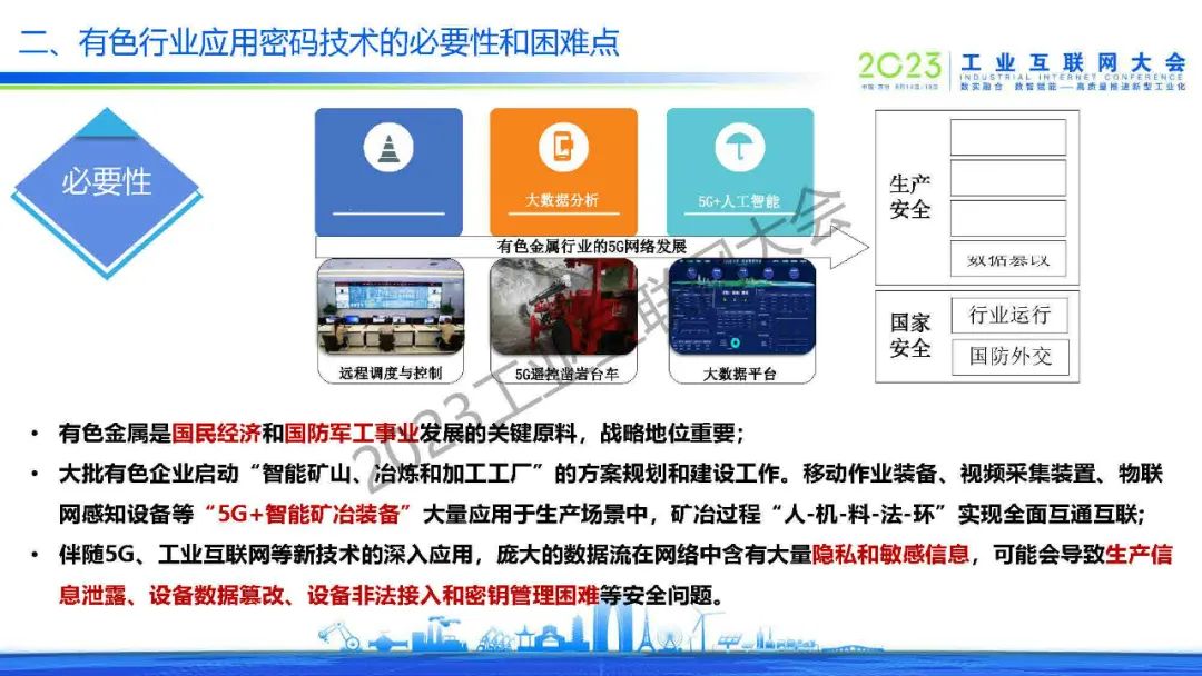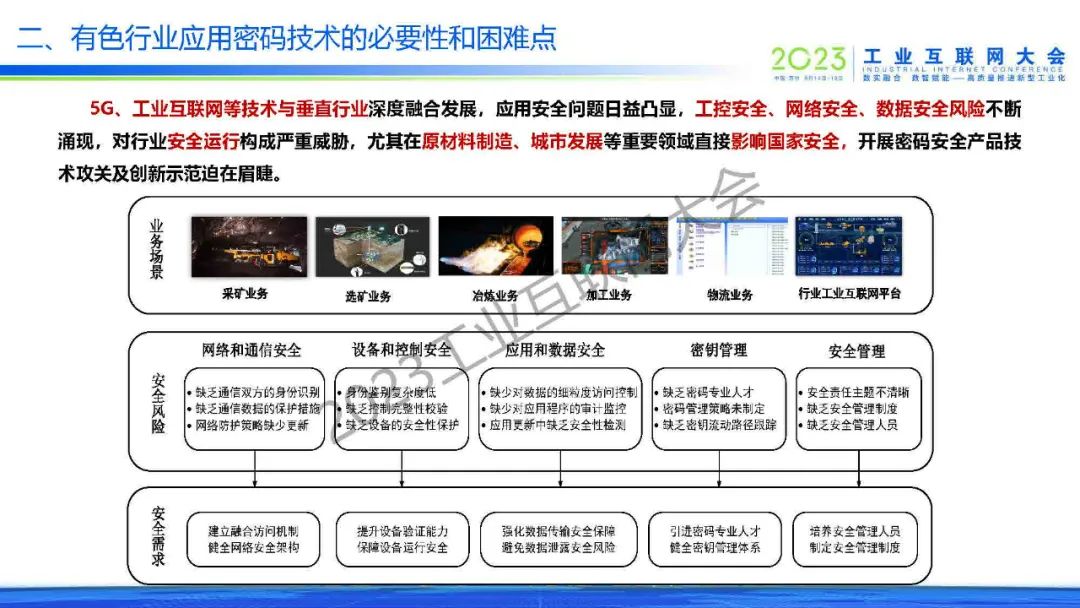 6月14日,在2023工業互聯網大會“工業互聯網密碼創新應用論壇”上,礦冶科技集團有限公司北礦智能科研部經理馬朝陽發表了《有色金屬行業密碼技術應用現狀與需求分析》的主題演講。