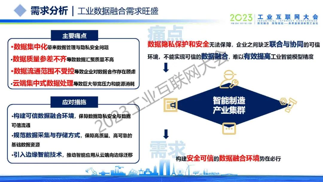 董勤喜介紹,工業(yè)數(shù)據(jù)融合需求旺盛,企業(yè)之間缺乏聯(lián)合與協(xié)同的可信環(huán)境,不能實現(xiàn)可信的數(shù)據(jù)融合,難以有效提高工業(yè)智能模型精度。邊緣智能關(guān)鍵技術(shù)以協(xié)同計算、資源隔離為核心,通常包括預(yù)測–訓(xùn)練云邊協(xié)同、云導(dǎo)向的云邊協(xié)同、邊緣導(dǎo)向的邊云協(xié)同、邊緣–邊緣協(xié)同、Docker容器技術(shù)、Kubernetes容器編排技術(shù)等。目前,數(shù)據(jù)安全防護、隱私保護以及數(shù)據(jù)價值聯(lián)合挖掘的市場需求巨大,需要對接可信工業(yè)數(shù)據(jù)空間,共建工業(yè)數(shù)據(jù)融合生態(tài),推廣應(yīng)用至更多場景和企業(yè)。