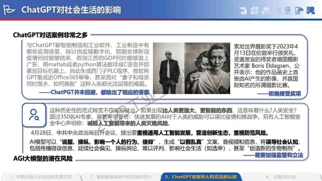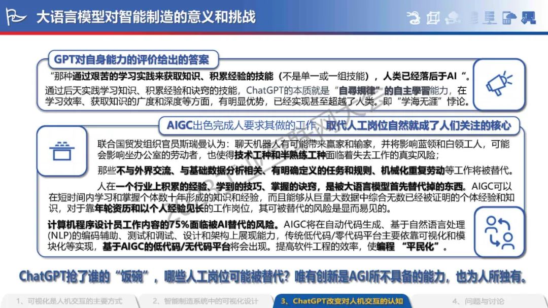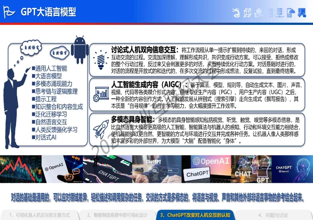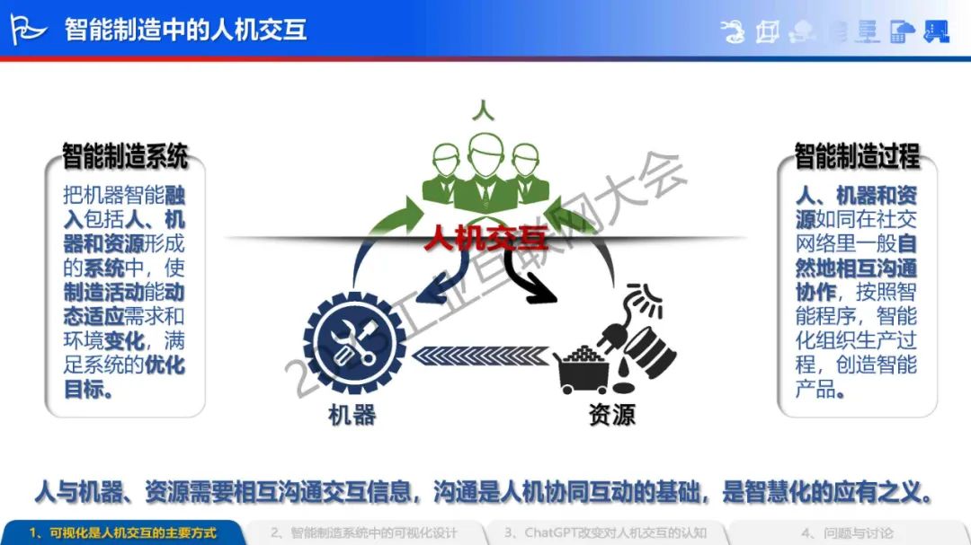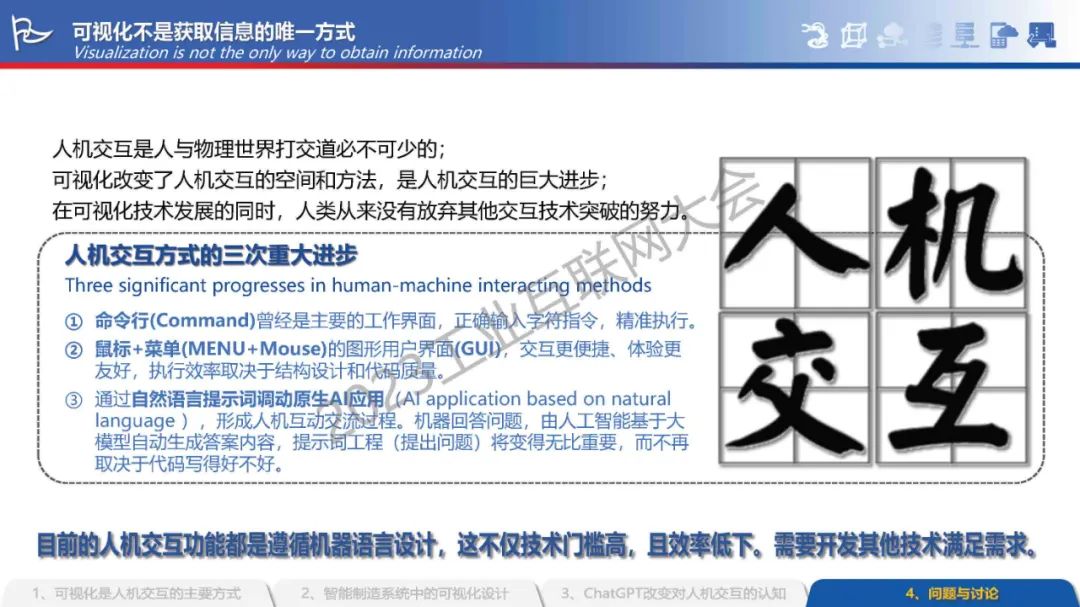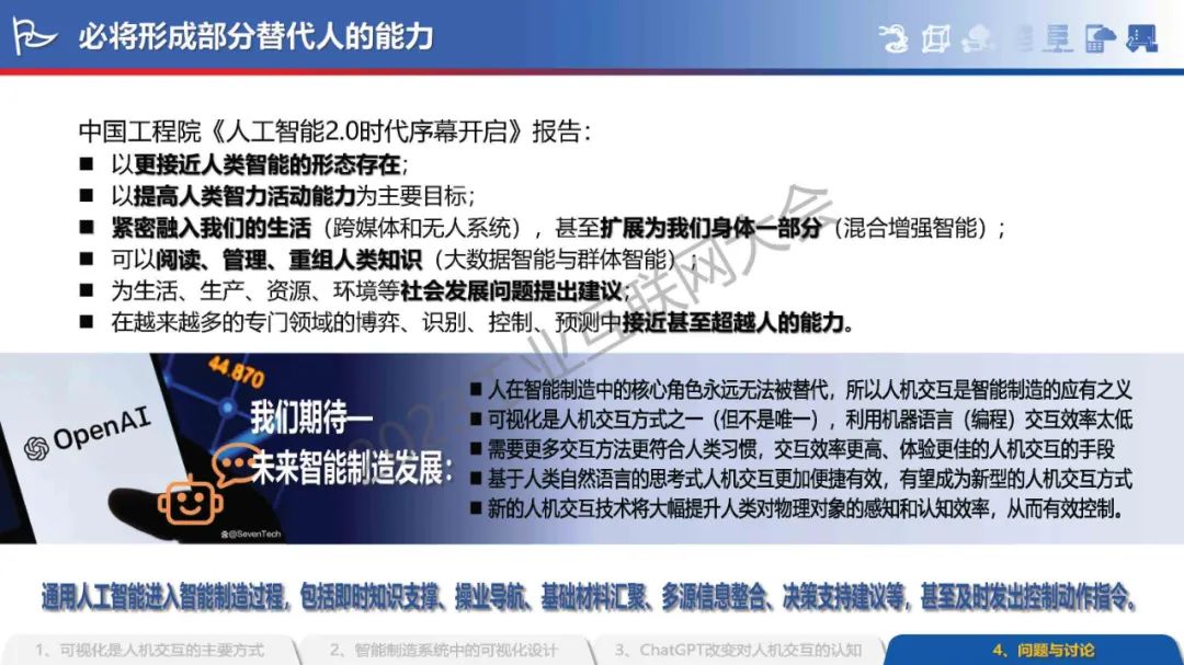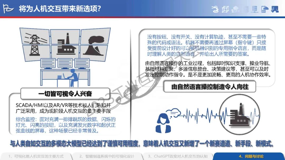 他表示,目前的人機(jī)交互功能都是遵循機(jī)器語(yǔ)言設(shè)計(jì),這不僅技術(shù)門檻高,且效率低下。需要開(kāi)發(fā)其他技術(shù)滿足需求。與人類自如交互的多模態(tài)大模型已經(jīng)達(dá)到了謹(jǐn)慎可用程度,意味著人機(jī)交互又新增了一個(gè)新賽道道、新手段、新模式。通用人工智能進(jìn)入智能制造過(guò)程,包括即時(shí)知識(shí)支撐、操業(yè)導(dǎo)航、基礎(chǔ)材料匯聚、多源信息整合、決策支持建議等,甚至及時(shí)發(fā)出控制動(dòng)作指令。
