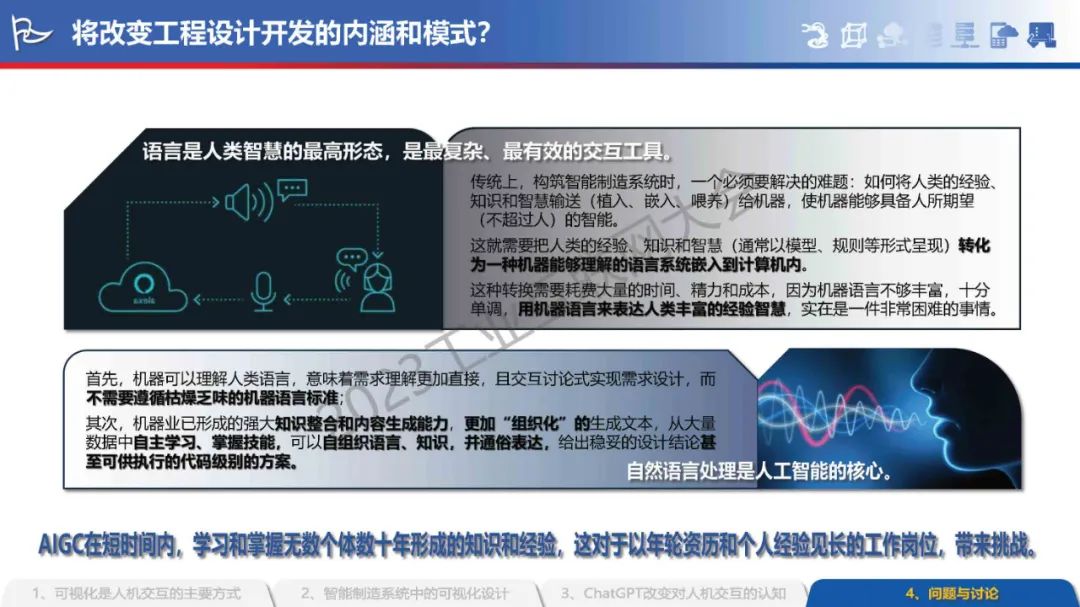 “自然語(yǔ)言處理是人工智能的核心,機(jī)器業(yè)已形成的強(qiáng)大知識(shí)整合和內(nèi)容生成能力,更加“組織化”的生成文本,從大量數(shù)據(jù)中自主學(xué)習(xí)、掌握技能,可以自組織語(yǔ)言、知識(shí),并通俗表達(dá),給出穩(wěn)妥的設(shè)計(jì)結(jié)論甚至可供執(zhí)行的代碼級(jí)別的方案。”
