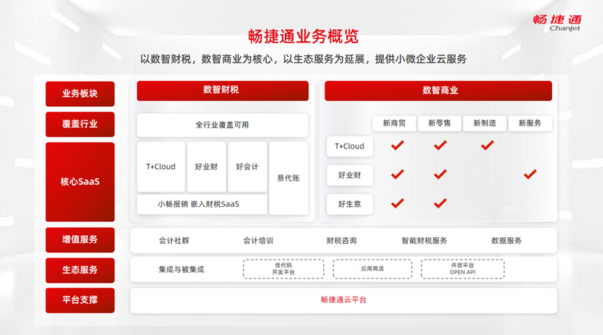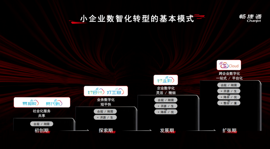 暢捷通為初創期的小微企業提供易報稅等服務,滿足其省心省力的剛需;在探索期,以好生意多個版本的數字化工具為小微企業賦能,助力企業在線拓客戶、在線做生意;在發展期,通過好業財數字化平臺幫助企業一站式管客戶、管合同、管項目、管銷購存,同時實現信息流、貨物流、發票流和資金流的四流合一,業財一致,助力企業合規發展;對于擴張期的小企業,暢捷通拳頭產品T+Cloud幫助企業數字化轉型賦能更顯威力,從產品設計到生產加工、從物料采購到倉儲物流、從客戶管理到供應商協同、從直營銷售到分銷零售管理、從物事人管理到票財稅銀檔一體化管控,幫助快速擴張的小企業實現全要素、全鏈路、全渠道、全流程數字化經營提效。
