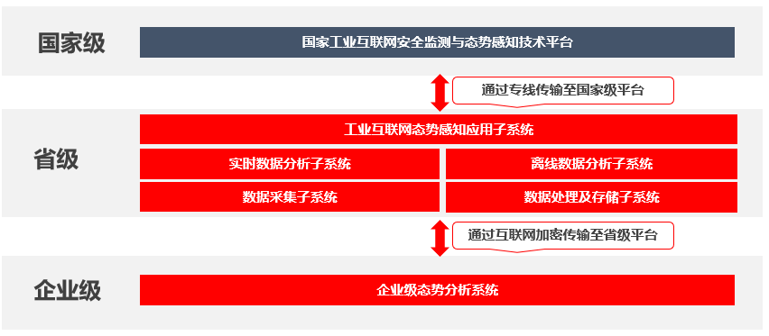 通過建設分布式工業互聯網數據采集系統、數據處理及存儲系統等子系統,構建省級工業互聯網安全監測與態勢感知平臺和企業級態勢分析系統,從監管層面實現省級工業互聯網安全全面及實時的監測。
