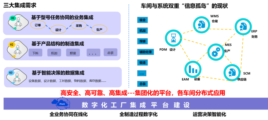 因?yàn)楹教煅b備制造行業(yè)的特殊性,同時(shí)還具有高安全、高可靠、高集成的要求;但是,現(xiàn)狀卻面臨著車間與系統(tǒng)的“雙重信息孤島”;集成平臺建設(shè)需求與“雙重信息孤島”是系統(tǒng)建設(shè)要解決的根本問題。
