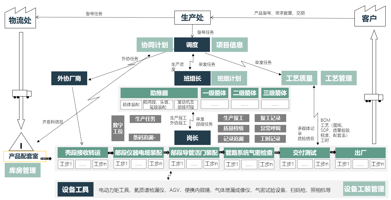 以數(shù)字化工廠平臺為基礎(chǔ),以總裝為起點(diǎn),向機(jī)加、輔助處理、部裝等制程輻射,實(shí)現(xiàn)航天裝備制造全業(yè)務(wù)流程、全價(jià)值鏈的數(shù)字化協(xié)同。