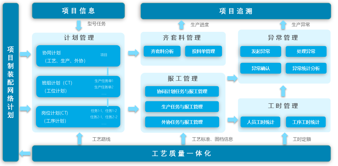 以單發(fā)產(chǎn)品的生產(chǎn)作為項(xiàng)目,通過單發(fā)總裝過程模型為網(wǎng)絡(luò)計(jì)劃控制主線,并貫穿于項(xiàng)目管理的整個(gè)過程;基于物料一物一碼的標(biāo)識編碼原則,從項(xiàng)目的立項(xiàng)開始到項(xiàng)目結(jié)束的全過程,其工藝文件發(fā)布、物料齊配套、設(shè)備工裝配套、生產(chǎn)進(jìn)程等方面實(shí)現(xiàn)項(xiàng)目的全方位管理,使單發(fā)產(chǎn)品在總裝過程中信息化、透明化,可視化,從而實(shí)現(xiàn)總裝生產(chǎn)的脈動式和單元式的靈活切換,達(dá)到進(jìn)度可控、風(fēng)險(xiǎn)提前預(yù)警的管理要求,真正做到存在即可追溯。