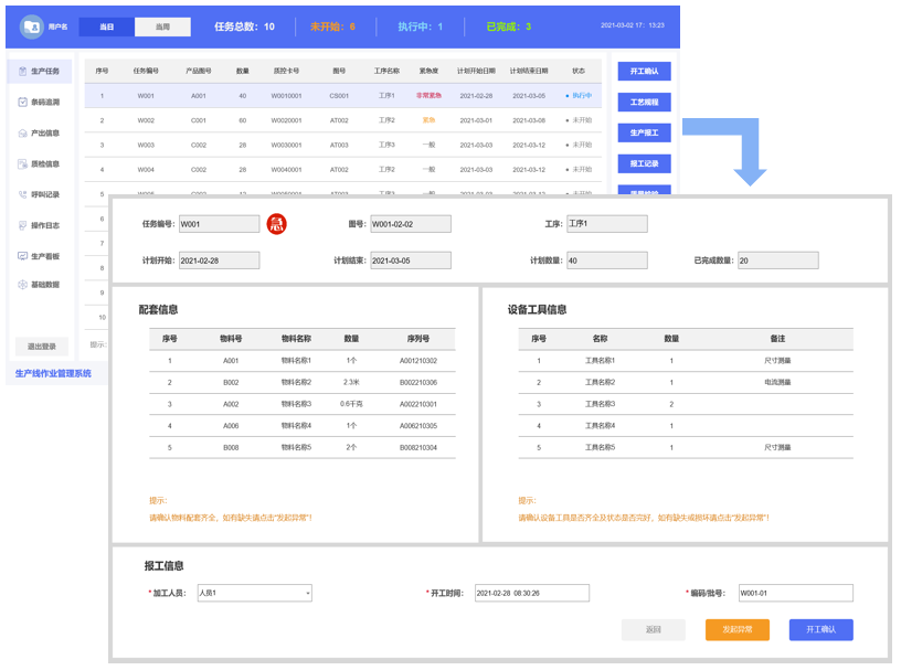 集成工藝管理平臺和制造運(yùn)營管理系統(tǒng)信息,通過在各生產(chǎn)單元一體機(jī)終端建立數(shù)字工位(HMI),作為生產(chǎn)管控平臺在現(xiàn)場的執(zhí)行抓手,包含生產(chǎn)準(zhǔn)備、生產(chǎn)報(bào)工、質(zhì)量檢驗(yàn)、異常處理等現(xiàn)場執(zhí)行操作業(yè)務(wù)模塊。
