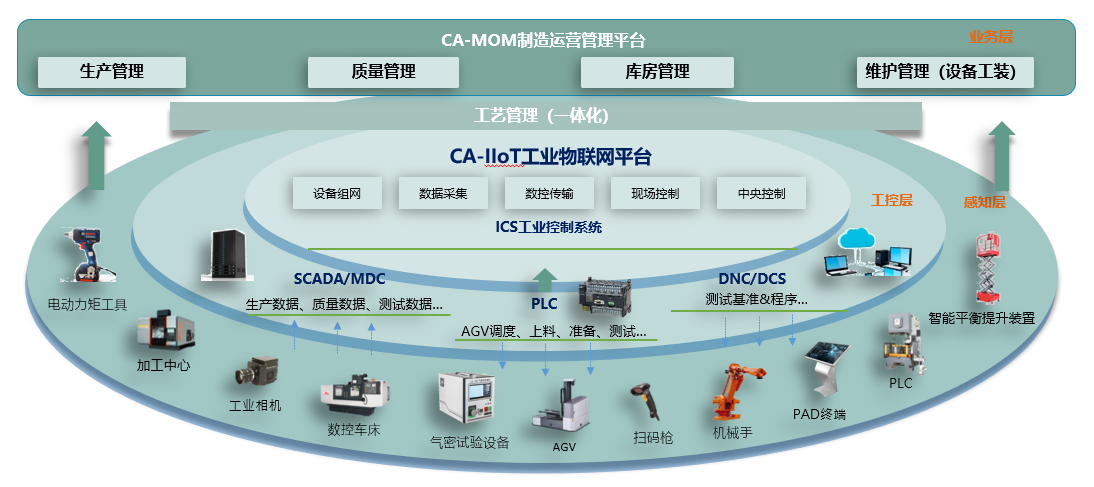 運(yùn)用物聯(lián)網(wǎng)、邊緣計(jì)算、工業(yè)控制等先進(jìn)互聯(lián)網(wǎng)技術(shù),建立CA-IIoT工業(yè)物聯(lián)網(wǎng)平臺,實(shí)現(xiàn)設(shè)備組網(wǎng)、數(shù)據(jù)采集、數(shù)控傳輸、現(xiàn)場控制、中央控制功能;基于5G通訊技術(shù)實(shí)現(xiàn)生產(chǎn)線業(yè)務(wù)層人、機(jī)、料、法、環(huán)、測各要素的數(shù)據(jù)連接、數(shù)據(jù)感知、數(shù)據(jù)采集、數(shù)據(jù)傳輸、數(shù)據(jù)存儲以及控制指令的下發(fā)。